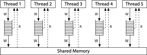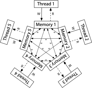 如果x86也是个状态机的话,那么和前面的状态机不太一样。他的模型是每个CPU都有buffer,在延时后才写入共享内存。