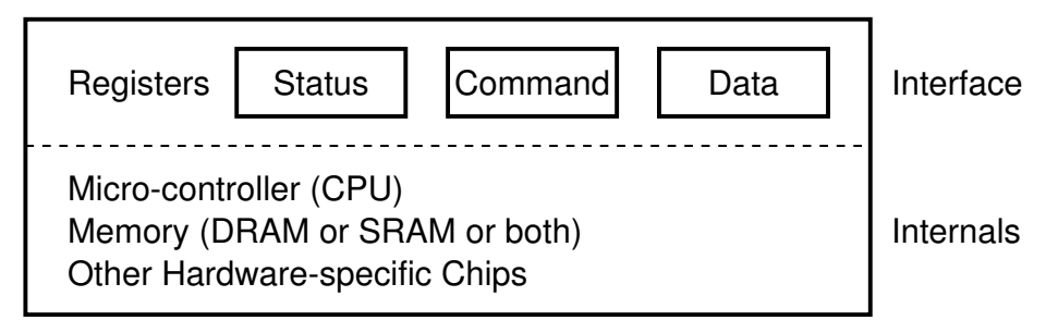 不管设备后面多复杂,可能有一个完整的计算机系统,如 SSD,还是可以抽象成这个样子,即询问硬盘状态,然后给命令控制,读写数据。