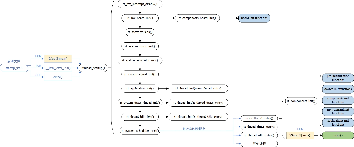 我们从代码推测电路系统的运行,代码离最终的机器码序列还有段距离。RT-Thread 支持不同的编译器和不同芯片,因此代码略微有差异,但是都是先从 .s 汇编启动文件开始运行,然后执行 RT-Thread 的启动函数 rtthead_startup() ,最后进入用户入口函数 main() ,来自官方文档的一张图:
